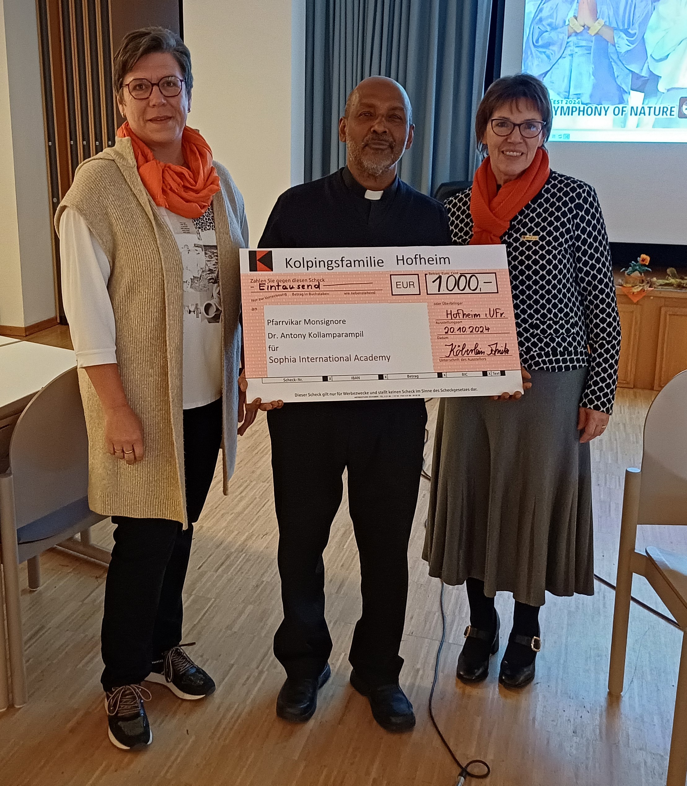Die Vorsitzende der Kolpingsfamilie Anita Köberlein dankte Pfarrvikar Monsignore Antony Kollamparampil und übergab einen Scheck im Wert von 1000€ für sein Projekt.